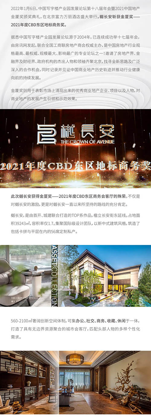 2022年1月6日,中國(guó)寫(xiě)字樓產(chǎn)業(yè)園發(fā)展論壇第十八屆年會(huì)暨2021中國(guó)地產(chǎn)金廈獎(jiǎng)?lì)C獎(jiǎng)典禮,在北京富力萬(wàn)麗酒店盛大舉行,樾長(zhǎng)安斬獲金廈獎(jiǎng)--2021年度CBD東區(qū)地標(biāo)商務(wù)獎(jiǎng)。