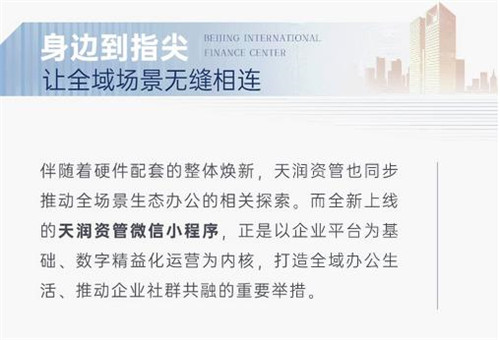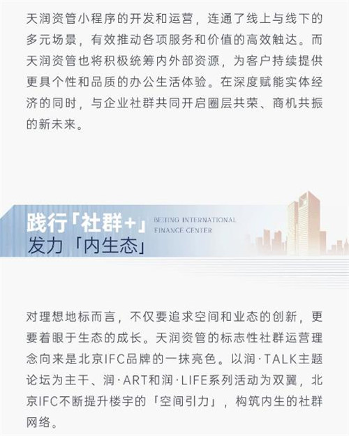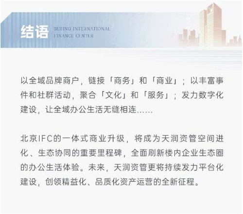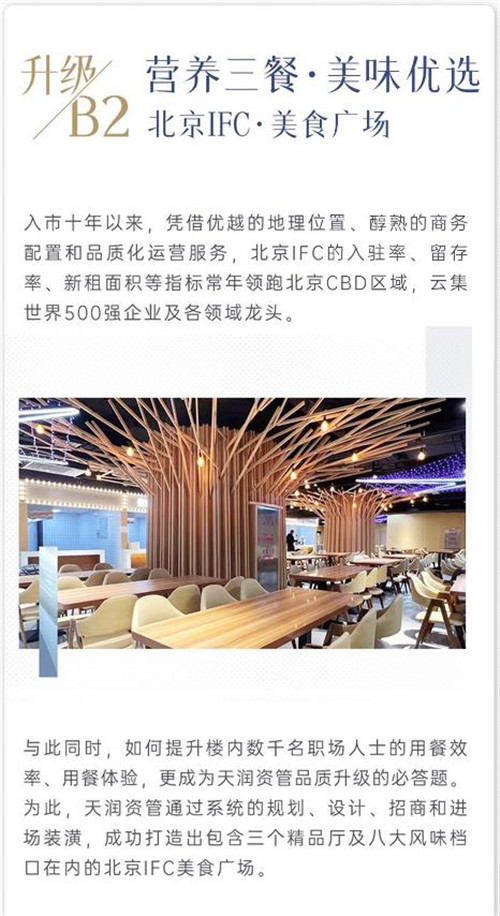 天潤(rùn)資管旗下雄踞CBD長(zhǎng)安街頭排的地標(biāo)寫(xiě)字樓--北京IFC國(guó)際財(cái)源中心,以大廈商業(yè)配套的整體煥新,為樓內(nèi)精英全面上新含餐飲、美業(yè)、康體、消費(fèi)在內(nèi)的一站式辦公生活。