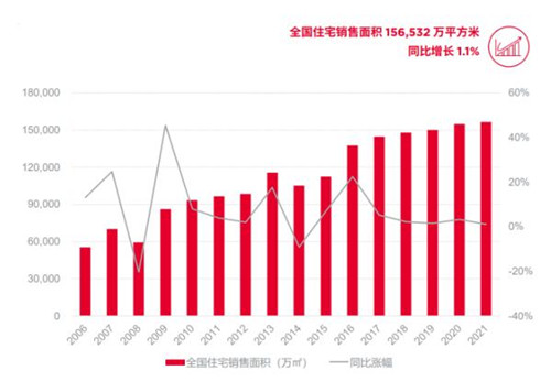 2021年,全國新房成交量156,532萬平方米,同比增長(zhǎng)1.1%,增速較上年滑落2.1個(gè)百分點(diǎn)。盡管全年累計(jì)銷售面積同比仍保持上漲,但單四季度住宅銷售面積41,100萬平方米,同比下降19.8%;銷售金額40,773億,同比下降20.2%。