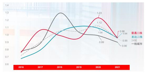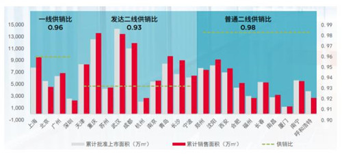2021年,24個(gè)重點(diǎn)城市一手住宅累計(jì)批準(zhǔn)上市面積共計(jì)25,747萬平方米,銷售面積共計(jì)27,068萬平方米,分別較上年同期下降7.3%和上升8.9%,供銷比由上年的1.12下降至0.95。其中一線城市供銷比由上年的0.99降至0.90;發(fā)達(dá)二線及普通二線城市亦降至0.96的水平。