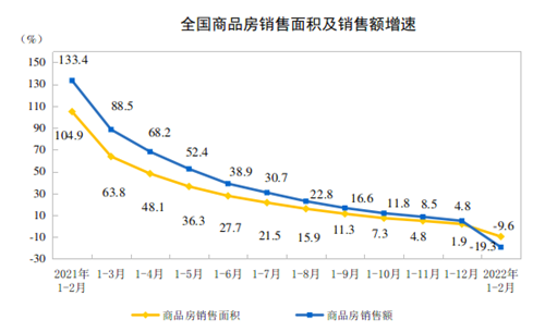 1—2月份,商品房銷(xiāo)售面積15703萬(wàn)平方米,同比下降9.6%,其中,住宅銷(xiāo)售面積下降13.8%;商品房銷(xiāo)售額15459億元,下降19.3%,其中,住宅銷(xiāo)售額下降22.1%。