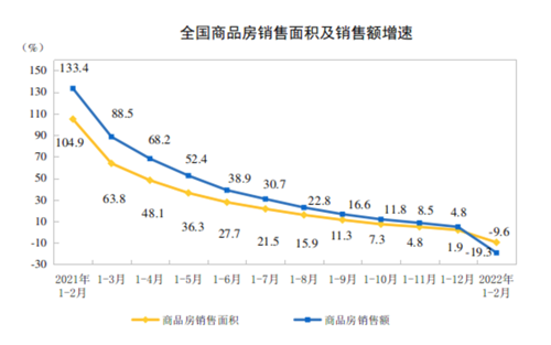 從銷售數(shù)據(jù)來看,2022年1-2月,全國商品房銷售金額、面積同比下降,其中銷售額降幅接近20%。特別是住宅銷售規(guī)模降幅較大,住宅銷售額同比降幅超兩成,銷售面積降幅在10%以上。