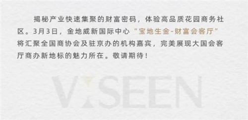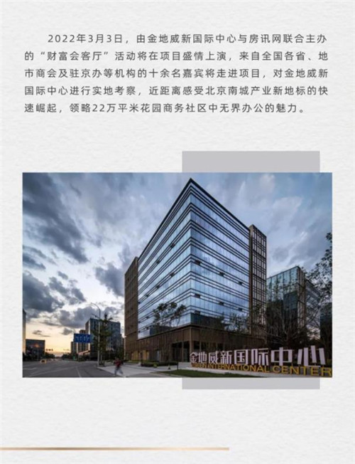 3月3日,由金地威新國(guó)際中心與房訊網(wǎng)聯(lián)合主辦的“財(cái)富會(huì)客廳”活動(dòng)將在項(xiàng)目盛情上演,來自全國(guó)各省、地市商會(huì)及駐京辦等機(jī)構(gòu)的十余名嘉賓將走進(jìn)項(xiàng)目,對(duì)金地威新國(guó)際中心進(jìn)行實(shí)地考察,近距離感受北京南城產(chǎn)業(yè)新地標(biāo)的快速崛起,領(lǐng)略22萬平米花園商務(wù)社區(qū)中無界辦公的魅力。