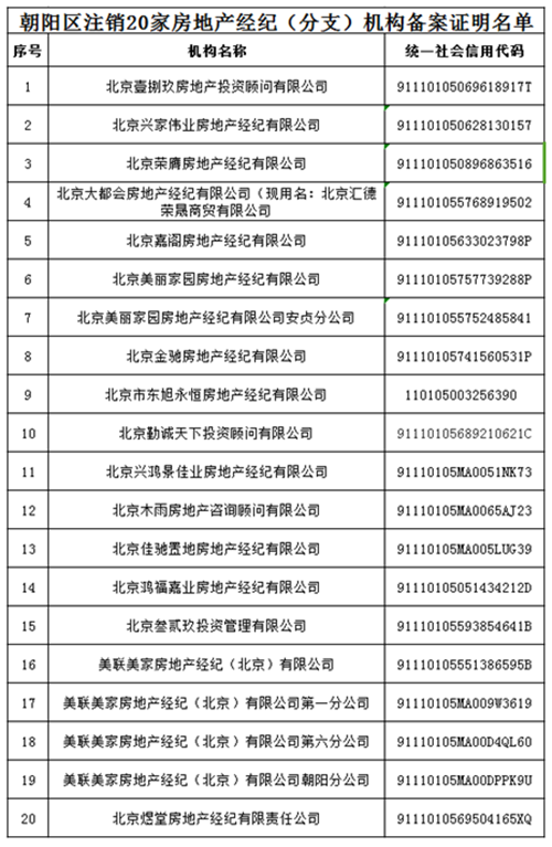 朝陽區(qū)注銷20家房地產(chǎn)經(jīng)紀(jì)(分支)機(jī)構(gòu)備案證明名單: