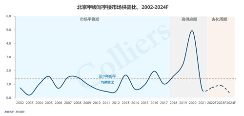 從2021年二季度開始,高力國際已表明整體市場需求報復性反彈不可持續(xù),凈吸納量將逐步回歸常態(tài),租金將在2021年底或今年一季度出現(xiàn)回暖。目前,2022年一季度的數(shù)據(jù)已印證了之前的判斷,同時,市場環(huán)境也在最近幾個月發(fā)生了新變化!笆紫,歷時四年的高供應時期已結束。2018年到2021年,市場年均新增供應量接近80萬平方米,今年的供應量將大幅減少。市場供需比在2020年觸及高點后已經(jīng)大幅回落,未來也將維持在較低水平。其次,2021年近120萬平方米需求量注定成為北京寫字樓市場的里程碑事件。市場參與者需要避免慣性思維,冷靜判斷2022年出現(xiàn)的新變化,積極應對新時期的市場走勢。最后,去化周期已經(jīng)開始,將至少持續(xù)3-4年,需求側強度將決定未來市場走勢。疫情的出現(xiàn)一定程度上提前了去化周期開始的時間。高力國際華北區(qū)副董事總經(jīng)理陳難表示,“從2021年開始,市場已經(jīng)進入去化周期,后續(xù)走勢取決于需求端的強度,大環(huán)境或將更有利于業(yè)主,留給企業(yè)租戶進行抄底的時間窗口期將越來越短。