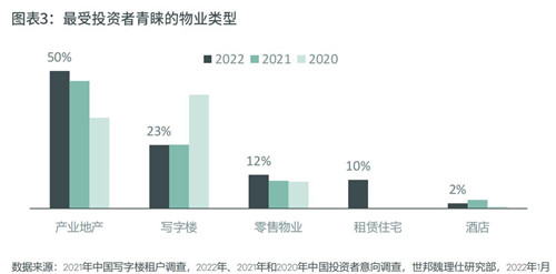 23%的投資者首選寫字樓,與上年相同,仍位居次席。2021年全國寫字樓凈吸納量達(dá)到創(chuàng)紀(jì)錄的740萬平方米,根據(jù)世邦魏理仕此前展開的寫字樓租戶調(diào)查,未來三年,60%的租戶計劃增加其辦公人員數(shù)量,釋放出寫字樓需求進(jìn)入新增長周期的強(qiáng)烈信號,也吸引投資者更積極地關(guān)注蓄勢待發(fā)的寫字樓投資機(jī)會。