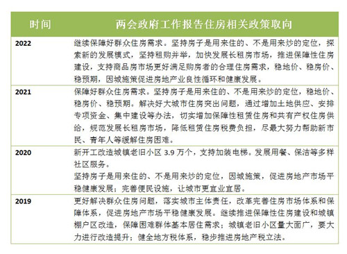 對于2022年房地產(chǎn)方面的工作部署,共120余字。工作報告指出,繼續(xù)保障好群眾住房需求。堅持房子是用來住的、不是用來炒的定位,探索新的發(fā)展模式,堅持租購并舉,加快發(fā)展長租房市場,推進保障性住房建設(shè),支持商品房市場更好滿足購房者的合理住房需求,穩(wěn)地價、穩(wěn)房價、穩(wěn)預(yù)期,因城施策促進房地產(chǎn)業(yè)良性循環(huán)和健康發(fā)展。