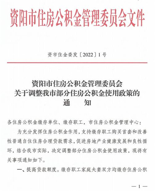 房訊網(wǎng)訊 近日,四川省資陽市發(fā)布《關(guān)于調(diào)整我市部分住房公積金使用政策的通知》,支持繳存職工購買首套和改善性普通自住住房合力貸款需求,促進(jìn)房地產(chǎn)業(yè)健康發(fā)展和良性循環(huán),結(jié)合本市實(shí)際,調(diào)整部分住房公積金使用政策。