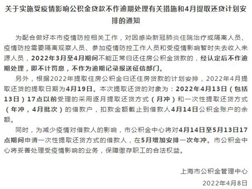 房訊網(wǎng)訊 近日,上海市公積金管理中心發(fā)布通知,公布實(shí)施受疫情影響公積金貸款不作逾期處理有關(guān)措施和4月提取還貸計(jì)劃安排。