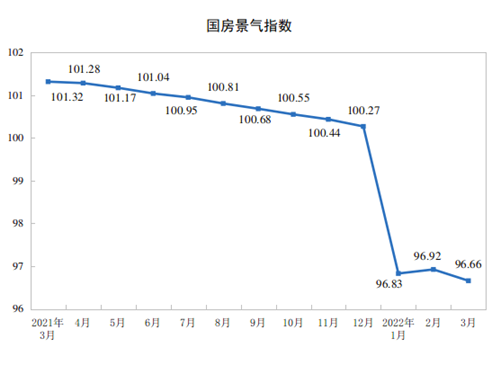 3月份,房地產(chǎn)開發(fā)景氣指數(shù)(簡稱“國房景氣指數(shù)”)為96.66。