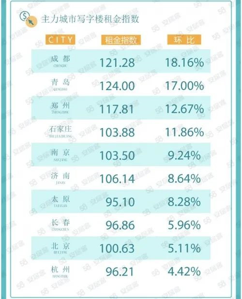 據(jù)58同城、安居客《2022年一季度三十城寫字樓租賃指數(shù)報告》顯示,一季度,三十個大中城市寫字樓租金指數(shù)為100.73,季度環(huán)比上漲3.29%,寫字樓租金指數(shù)五連增,兩年多來首次超過疫情前水平。成都以18.16%的漲幅位居漲幅榜第一,青島、鄭州、石家莊等二線城市漲幅靠前。