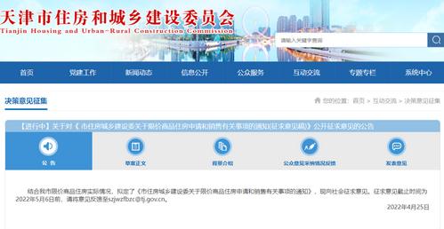 日前,天津市住建委發(fā)布公開征求意見的公告,結(jié)合我市限價(jià)商品住房實(shí)際情況,擬定了《市住房城鄉(xiāng)建設(shè)委關(guān)于限價(jià)商品住房申請(qǐng)和銷售有關(guān)事項(xiàng)的通知》,通知中明確,自2022年7月1日起,全市停止受理限價(jià)商品住房資格申請(qǐng);自2022年10月1日起,全市停止限價(jià)商品住房銷售。