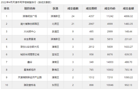 2022年4月,天津市寫字樓成交量前十的樓盤為 :濱海明發(fā)廣場(chǎng)、清大博雅總部園區(qū)、大光明中心、合生君景灣、聯(lián)東U谷總部大觀、城投華潤理想之城、鑫谷、星海紫旭府、天津錦聯(lián)新經(jīng)濟(jì)產(chǎn)業(yè)園、路勁壹棟島。其中,成交套數(shù)最多的是濱海明發(fā)廣場(chǎng)共成交24套,成交面積為4357㎡,成交均價(jià)為11242元/㎡,成交金額為4898.32萬元。