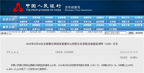 房訊網(wǎng)訊 中國(guó)人民銀行授權(quán)全國(guó)銀行間同業(yè)拆借中心公布,2022年6月20日貸款市場(chǎng)報(bào)價(jià)利率(LPR)為:1年期LPR為3.7%,5年期以上LPR為4.45%。以上LPR在下一次發(fā)布LPR之前有效。