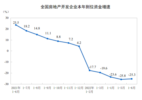 1—6月份,房地產(chǎn)開發(fā)企業(yè)到位資金76847億元,同比下降25.3%。其中,國內(nèi)貸款9806億元,下降27.2%;利用外資55億元,增長30.7%;自籌資金27224億元,下降9.7%;定金及預(yù)收款24601億元,下降37.9%;個人按揭貸款12158億元,下降25.7%。