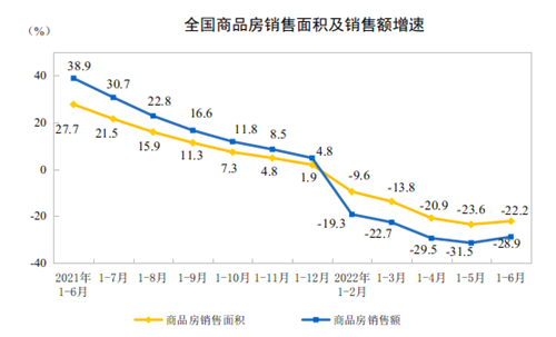 1—6月份,商品房銷售面積68923萬平方米,同比下降22.2%;其中,住宅銷售面積下降26.6%。商品房銷售額66072億元,下降28.9%;其中,住宅銷售額下降31.8%。