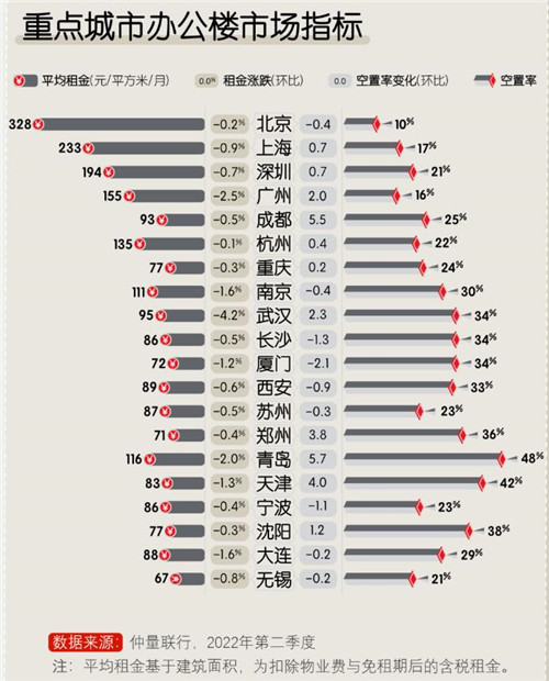 房訊網(wǎng)訊 2022上半年疫情多點散發(fā),對經(jīng)濟運行和商務活動造成一定程度的擾動,從而影響各地辦公樓市場表現(xiàn)。仲量聯(lián)行近日發(fā)布第二季度中國40城辦公樓市場指數(shù)顯示,全國大部分辦公樓市場表現(xiàn)低迷,增量需求回落,各地租金均有不同程度下滑。