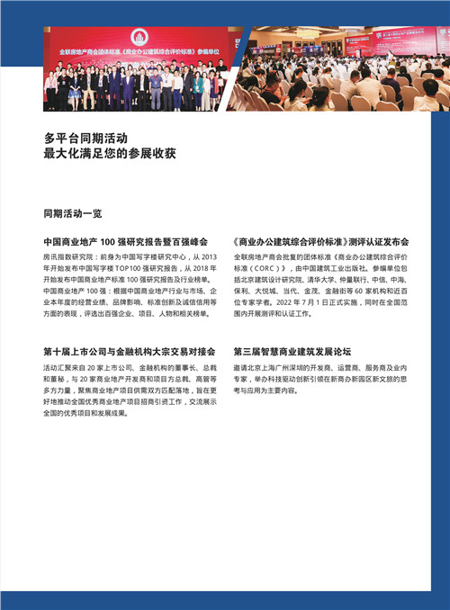 展覽會(huì)期間,第四屆中國(guó)商業(yè)地產(chǎn)品牌建設(shè)論壇、第三屆智慧商業(yè)建筑發(fā)展論壇、第十期商辦物業(yè)大宗交易對(duì)接會(huì)將同期舉辦,邀請(qǐng)百?gòu)?qiáng)房企、行業(yè)大咖、專家學(xué)者、地產(chǎn)精英、投資機(jī)構(gòu)等齊聚一堂,探索新周期下行業(yè)新的發(fā)展模式,為中國(guó)商業(yè)地產(chǎn)的高質(zhì)量發(fā)展探尋方向和路徑。
