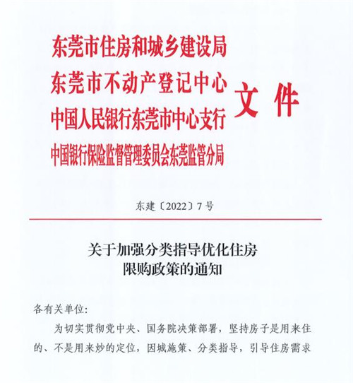 根據(jù)通知規(guī)定,從2022年7月4日起,東莞市住房限購區(qū)域調(diào)整為莞城街道、東城街道、南城街道、萬江街道、松山湖高新技術(shù)產(chǎn)業(yè)開發(fā)區(qū)(以下簡稱“限購區(qū)域”),本市戶籍居民家庭在限購區(qū)域內(nèi)擁有2套及以上住房的,暫停向其銷售限購區(qū)域內(nèi)的新建商品住房,非本市戶籍居民家庭在限購區(qū)域內(nèi)擁有2套及以上住房的,暫停向其銷售限購區(qū)域內(nèi)的商品住房(含新建商品住房和二手住房)。非本市戶籍居民家庭在限購區(qū)域內(nèi)購買第1套、第2套商品住房,需按原政策標(biāo)準(zhǔn)提供社會保險費或個人所得稅繳納證明;《關(guān)于促進(jìn)房地產(chǎn)市場平穩(wěn)健康發(fā)展的通知》(東建〔2022〕4號,即“莞七條”)中的二(三)孩家庭可新增購買1套住房、“雙(多)證房”認(rèn)定為1套住房等政策仍適用于限購區(qū)域。除上述限購區(qū)域外,東莞市其他區(qū)域暫停實行住房限購政策,居民家庭在非限購區(qū)域購買商品住房,無需進(jìn)行購房資格核驗。