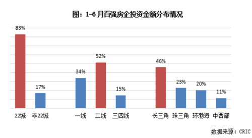 克而瑞數(shù)據(jù)顯示,上半年,銷(xiāo)售百?gòu)?qiáng)房企83%的投資金額集中在22個(gè)試點(diǎn)集中供地的核心城市,龍湖、建發(fā)、華潤(rùn)等房企均有八成以上金額投資于集中供地城市。