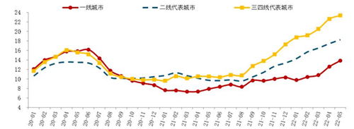 其中,截至2022年5月底,按近6個(gè)月月均銷售面積計(jì)算,一線城市短期庫(kù)存出清周期13.9個(gè)月;二線代表城市出清周期18.3個(gè)月,較2021年末延長(zhǎng)4.9個(gè)月,短期庫(kù)存面臨一定壓力;三四線代表城市出清周期23.4個(gè)月,較2021年末延長(zhǎng)6.1個(gè)月,市場(chǎng)庫(kù)存去化壓力較大。