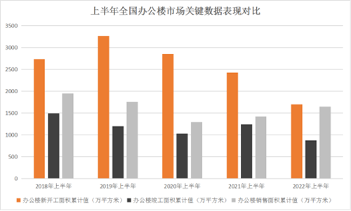 市場(chǎng)供需來(lái)看,2022年1-6月,全國(guó)辦公樓開(kāi)發(fā)投資額為2616億元,同比下降10.1%,較疫情最初爆發(fā)的2020年也有4%的降幅,是近5年同期數(shù)據(jù)的最低值,反映出企業(yè)開(kāi)發(fā)投資意愿的低迷。