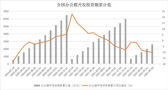 2022年1-6月,全國(guó)辦公樓開(kāi)發(fā)投資額為2616億元,同比下降10.1%,較疫情最初爆發(fā)的2020年也有4%的降幅,是近5年同期數(shù)據(jù)的最低值,反映出企業(yè)開(kāi)發(fā)投資意愿的低迷。