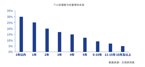 報告指出,從微觀層面看,樓齡和物業(yè)類型是影響小區(qū)空置率的兩大因素。就房屋本身的屬性來看,住房空置率隨著小區(qū)樓齡的增長逐漸變低。5年以內(nèi)樓齡的小區(qū),空置率隨樓齡的增長從30%依次遞減至12%;15年以上樓齡的小區(qū)空置率沒有明顯差異。