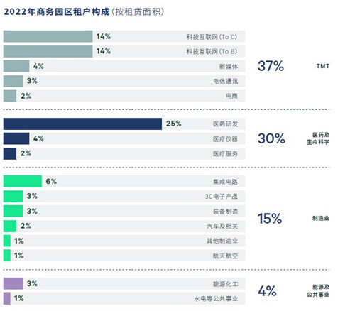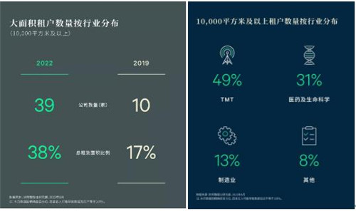 近年商務(wù)園區(qū)一萬平方米及以上租戶無論在數(shù)量還是在租賃面積上都有顯著增長,顯示商務(wù)園區(qū)對頭部企業(yè)的吸引力。其中,半數(shù)來自TMT企業(yè),而醫(yī)藥及生命科學(xué)占近三分之一。商務(wù)園區(qū)學(xué)院派的辦公環(huán)境,更低的租金成本和更優(yōu)惠的產(chǎn)業(yè)政策,對大型高精尖企業(yè)具有很大的吸引力。