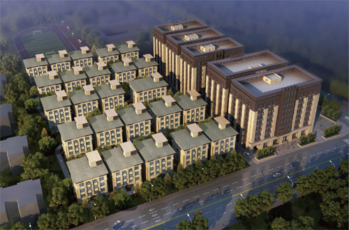 園區(qū)內(nèi)部由中心綠地、步行休閑場所、院落綠地組成3級環(huán)境綠化體系,與周邊生態(tài)環(huán)境連為一體,建筑與自然有機共生。