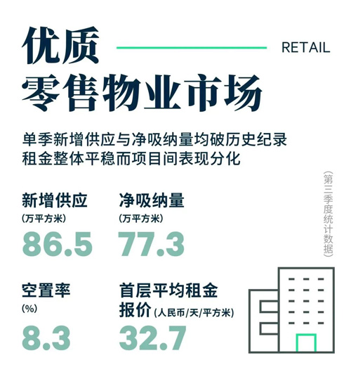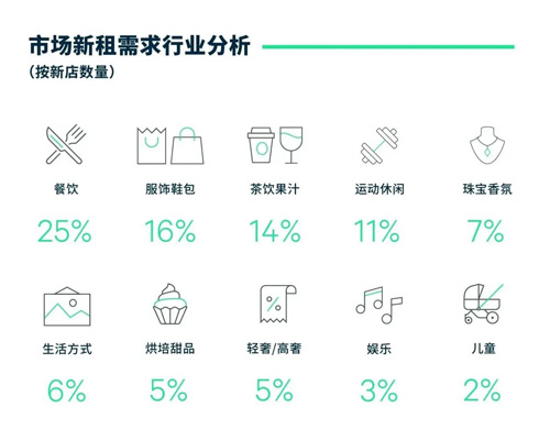 新開業(yè)項目多聚焦娛樂文化與精致家庭生活,以親子娛樂、地域美食、圈層社交、寵物友好等為主要招商理念吸引眾多餐飲、零售及生活方式品牌,如五棵松萬達的主題樂園MELAND CLUB亞洲旗艦店、龍湖北苑的本幫菜頭部選手桂滿隴、朝外THE BOX的MARSMART火星寵物超市等。既有項目方面,全國及北京首店在優(yōu)質購物中心多點開花,餐飲類首店以融合菜、茶飲、烘焙等業(yè)態(tài)為主,如山居滿隴、茉莉奶白、RAPL現烤卡仕達蘋果派等,而零售類首店則包括運動品牌Icebreaker、潮流服飾MOF Girls'mall、集合店Shel'tter等。整體來看總新增需求中餐飲業(yè)態(tài)以25%的新店占比持續(xù)領跑,其次是茶飲果汁、運動休閑以及輕奢/高奢品類等。疫情后各大商業(yè)體持續(xù)進行業(yè)態(tài)結構與品牌組合調整,季內錄得多個高端品牌換位至首層優(yōu)質鋪位。兒童體驗類業(yè)態(tài)遭遇復蘇疲軟,多家連鎖品牌縮減整合或閉店。全市凈吸納量在新增項目高開業(yè)率帶動下一洗上半年疲軟態(tài)勢,破歷史紀錄達77.3萬平方米,空置率環(huán)比小幅上漲0.2個百分點至8.3%。