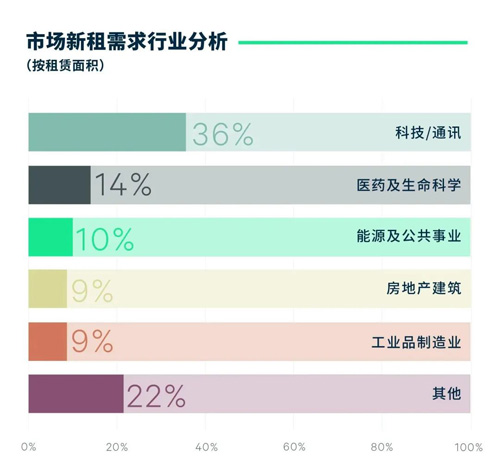 本季新租需求行業(yè)分布較上半年更為多元化,TMT、醫(yī)藥健康和能源及公共事業(yè)靠前但優(yōu)勢(shì)不明顯,分別占36%,14%和10%。TMT釋放的需求中以人工智能、區(qū)塊鏈相關(guān)的軟件系統(tǒng)開(kāi)發(fā)以及電商類的板塊尤為突出,而醫(yī)藥健康行業(yè)隨著融資端的放緩,新租需求以中型成熟企業(yè)擴(kuò)租為主,新成立和新入京企業(yè)有限。
