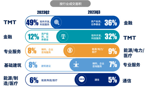 按行業(yè)劃分的租賃活動中,以金融行業(yè)為首,占36%,照二季度占比上升;TMT行業(yè)占據(jù)了32%的第二大份額,相較上個季度有所下降;能源電力醫(yī)療行業(yè)以9%的占比排列第三。相較于上季度,麗澤商圈在2023年前9個月的成交面積相當于其他商圈突飛猛進,成交面積錄得16%,是本季度成交面積最多的核心商圈。