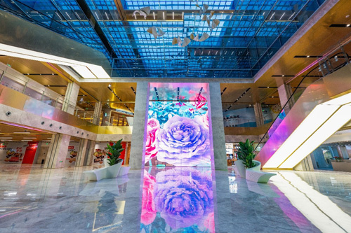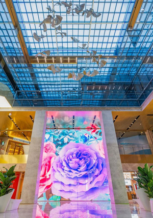 而與沐光翱翔的飛鳥近相呼應的,還有中庭B1巨型LED透明屏幕上由藝術(shù)家組合RICH & MIYU創(chuàng)作的數(shù)字藝術(shù)品。RICH&MIYU從微觀角度出發(fā),取材北京市市花月季的生命輪回,以循環(huán)生發(fā)、彌散、再匯聚成月季花群的粒子大觀,為「飛鳥」的生長、起飛勾勒出自然本源,詮釋萬物輪回、蓬勃發(fā)展的深刻內(nèi)涵。