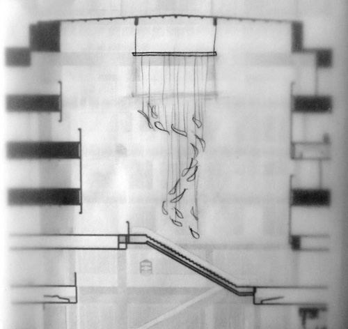 為最大化避免金屬絲的纏繞,UAP上海團隊提前在工廠進行多輪1:1懸掛測試,經(jīng)充分實踐和測算,最終與大廈敲定使用線軸地面固定的形式,逐層、逐只進行懸掛,以保證藝術(shù)品在空間中呈現(xiàn)正確的形態(tài)。