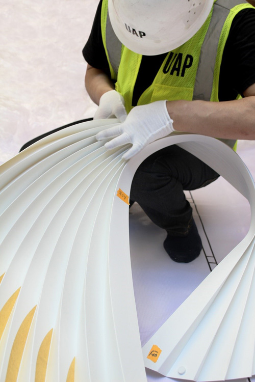 為兼顧《成雙》在匯京雙子座大廈的動態(tài)表現(xiàn)和中庭空間布置的多重需求,UAP上海團隊展開多方位測試,最終選定進口特種板材。經(jīng)適當?shù)募訙囟ㄐ头绞,讓精致折疊的線性幾何圖形,還原飛鳥振翅栩栩如生的姿態(tài)。而噴繪于每只作品折面的金箔,更讓光影在明暗變化中呈現(xiàn)更豐富的層次,滿足觀者在中庭多個視角下欣賞作品的感官體驗。