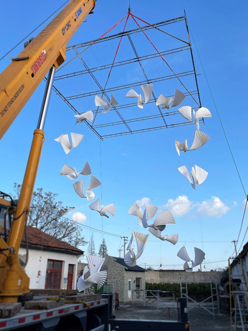 在進場環(huán)節(jié),《成雙》的完整造型共計有26只形態(tài)各異的「飛鳥」,都需在「城市庭院」中庭的陽光天幕完成整體吊裝。這一過程中不僅涉及到上百根輕柔金屬絲,還要保證不同高度、不同間距的金屬絲能以垂直吊掛的形式,保證「飛鳥」在空中的正確定點。