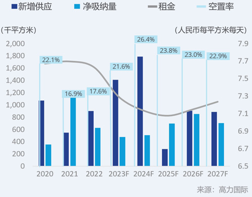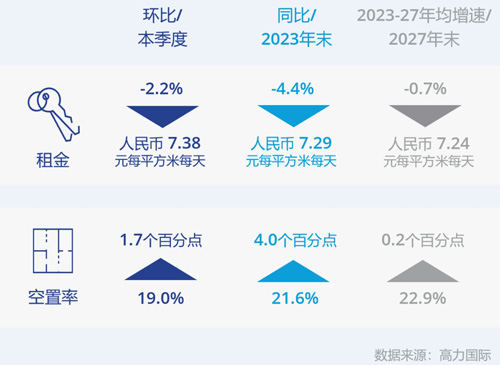 本季度空置率環(huán)比上漲1.7個百分點至19.0%。供應(yīng)高峰將持續(xù)推高全市空置率。