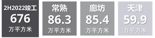 2022年下半年竣工面積最大的城市為常熟,達(dá)86.3萬(wàn)平方米,廊坊以85.4萬(wàn)緊隨其后,這兩個(gè)城市都在短期內(nèi)迎來了大量新增供應(yīng)。