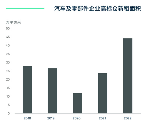 中國(guó)產(chǎn)業(yè)升級(jí)下供應(yīng)鏈物流日益重要。近年來(lái)狂飆突進(jìn)的中國(guó)新能源汽車(chē)產(chǎn)業(yè)帶來(lái)了從生產(chǎn)、流通、銷(xiāo)售到后市場(chǎng)的全鏈條高標(biāo)倉(cāng)需求的加速擴(kuò)張。CBRE的統(tǒng)計(jì)數(shù)據(jù)顯示,2022年汽車(chē)及零部件企業(yè)高標(biāo)倉(cāng)新租交易面積近45萬(wàn)平方米,同比增長(zhǎng)86%并創(chuàng)歷史新高。