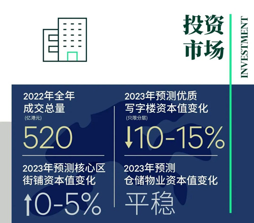 “持續(xù)加息、股市下行及經(jīng)濟衰退降低了2022年的投資意愿。在三年的疫情后,中國內(nèi)地和香港特區(qū)通關(guān)將逐步加快各行各業(yè)的業(yè)務流動,改善投資市場氣氛。由于高融資成本仍是主要障礙,預計2023年上半年整體交投淡靜,但隨著經(jīng)濟穩(wěn)步復蘇,下半年或有所改善。”