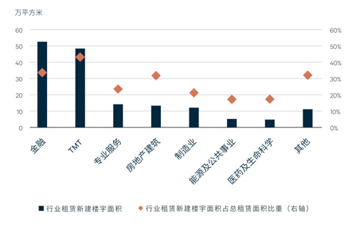 房地產(chǎn)建筑業(yè)也有32%的總租賃面積落位于新建樓宇,主要來自開發(fā)商在新項(xiàng)目中自用面積、地產(chǎn)服務(wù)類公司的升級搬遷以及第三方辦公運(yùn)營商的擴(kuò)張布局;