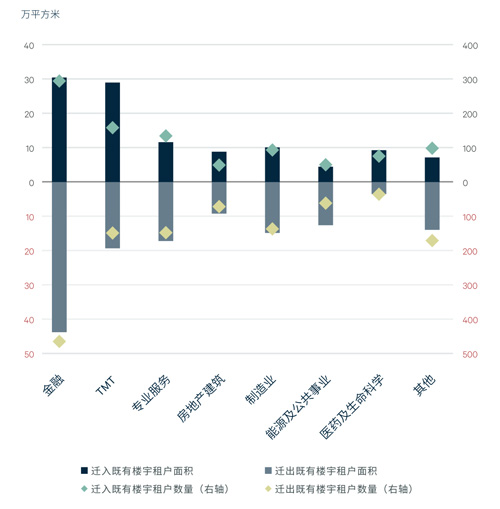 金融是新建樓宇中租賃面積最多的行業(yè),主要吸引保險(xiǎn)、證券和基金租戶擴(kuò)張和升級,以及傳統(tǒng)金融機(jī)構(gòu)總部、后臺部門和金融科技類公司進(jìn)駐。金融在既有樓宇則是遷出多于遷入,以中小型金融機(jī)構(gòu)的退出或者替換為主;