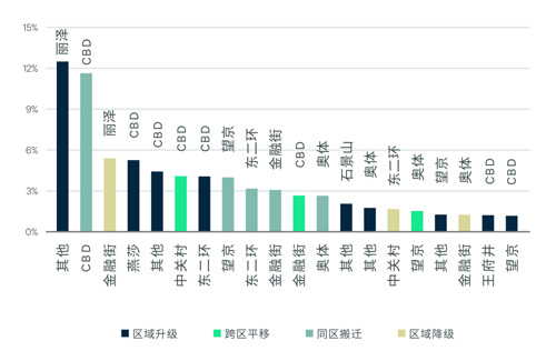 注:區(qū)域升級指搬往更高梯隊(duì)的商務(wù)區(qū)(區(qū)域按梯隊(duì)由高至低分別為核心商務(wù)區(qū)、核心拓展區(qū)、新興商務(wù)區(qū)、其他區(qū)域),以此類推