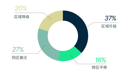 區(qū)域升級是過去三年占比最大的搬遷流向類型,其次為同區(qū)搬遷,但相對區(qū)域降級和跨區(qū)平移的優(yōu)勢并不明顯,租戶流向選擇較為多元和均衡;