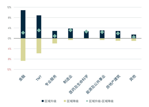 分行業(yè)看,金融和TMT的區(qū)域升級和降級活動均為所有行業(yè)中最活躍的,而TMT體現(xiàn)比金融更明顯的中心化(升級多于降級)。此外,制造業(yè)、醫(yī)藥及生命科學(xué)也體現(xiàn)較高的中心化程度,而專業(yè)服務(wù)和其他行業(yè)中的文體娛樂的中心化程度則較低。