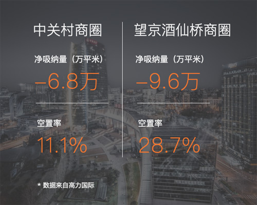 根據(jù)高力國際數(shù)據(jù),中關(guān)村和大望京全年凈吸納量分別為-6.8萬平方米和-9.6萬平方米;中關(guān)村空置率達(dá)到11.1%,這是近15年里首次攀升至10%以上;望京酒仙橋的空置率同比上漲超過20%,達(dá)到28.7%。