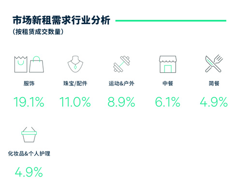受新項(xiàng)目帶動(dòng),單季零售業(yè)態(tài)占比同比及環(huán)比分別上升了20和10個(gè)百分點(diǎn),依然延續(xù)了一直以來(lái)以服飾和珠寶配件為前兩大需求的態(tài)勢(shì)。其中服飾類新租賃需求占比為19.1%,品牌不但涵蓋國(guó)內(nèi)連鎖女裝、潮牌,而且還有來(lái)自于美國(guó)、法國(guó)和日本的國(guó)際品牌。珠寶配件品牌為全市貢獻(xiàn)了11.0%的需求,除熱度持續(xù)的傳統(tǒng)珠寶品牌周大福、謝瑞麟和老鳳祥外,美國(guó)鉆石品牌Tiffany & Co.也在深圳開出了第二家店。此外,同樣受新項(xiàng)目的帶動(dòng),運(yùn)動(dòng)品牌在本季表現(xiàn)不俗,共錄得22個(gè)品牌入市,全市需求占比為8.9%,其中New Balance和安踏均開出3家,Descente開出2家。