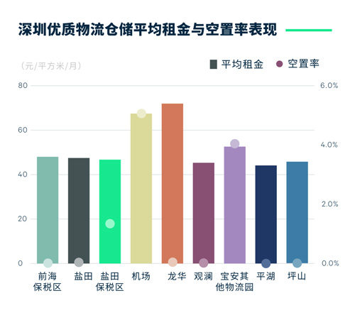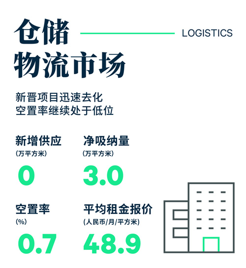 國(guó)門開放后物流渠道的暢通令保稅倉(cāng)的出貨頻率增加,原本在疫情期間囤積的貨物得以離岸,帶動(dòng)第三方物流成為本季的主要需求來(lái)源。此外,以生物醫(yī)藥和電子產(chǎn)品為主的制造業(yè)也為整體市場(chǎng)貢獻(xiàn)了不俗的需求。旺盛市場(chǎng)需求帶動(dòng)于上個(gè)季度新交付的項(xiàng)目在本季實(shí)現(xiàn)了入駐率的大幅提升,并由此帶動(dòng)整體市場(chǎng)空置率環(huán)比下降1.1個(gè)百分點(diǎn)至0.7%的極低水平,整體市場(chǎng)依然呈現(xiàn)極度的供不應(yīng)求。租金方面,極度供不應(yīng)求推動(dòng)市場(chǎng)平均租金保持穩(wěn)定增長(zhǎng),環(huán)比增長(zhǎng)0.6%至每月每平方米48.9元。