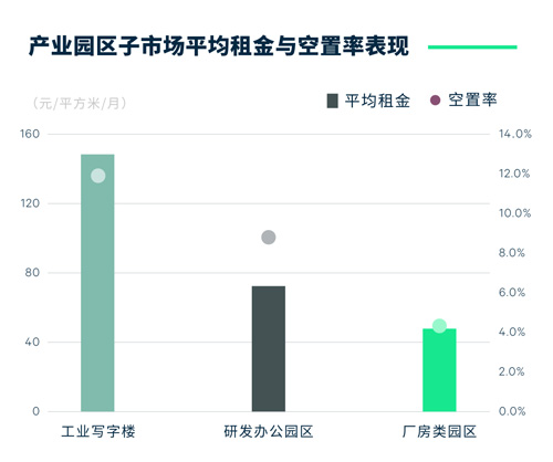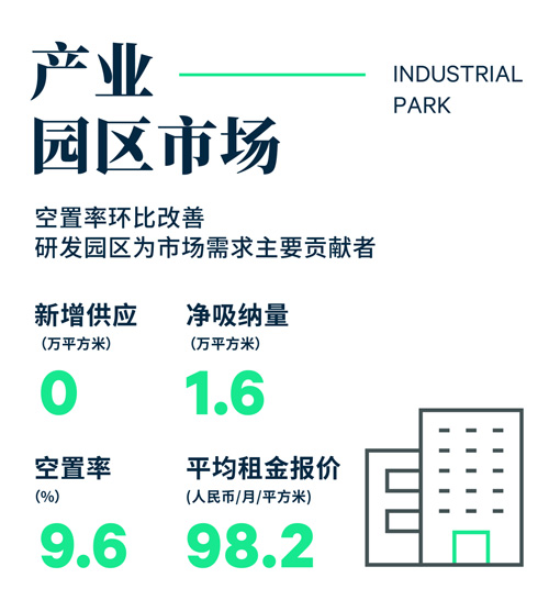 市場(chǎng)平均租金環(huán)比持平,停留在每月每平方米98.2元。不同類型子市場(chǎng)租金表現(xiàn)分化,廠房類園區(qū)得益于長(zhǎng)租約效應(yīng),租金環(huán)比上漲0.6%至每月每平方米49.2元。研發(fā)辦公園區(qū)租金季內(nèi)保持穩(wěn)定。而工業(yè)寫字樓市場(chǎng)因業(yè)主繼續(xù)延用2022年租金優(yōu)惠政策,平均租金環(huán)比下調(diào)0.1%至每月每平方米149.1元。